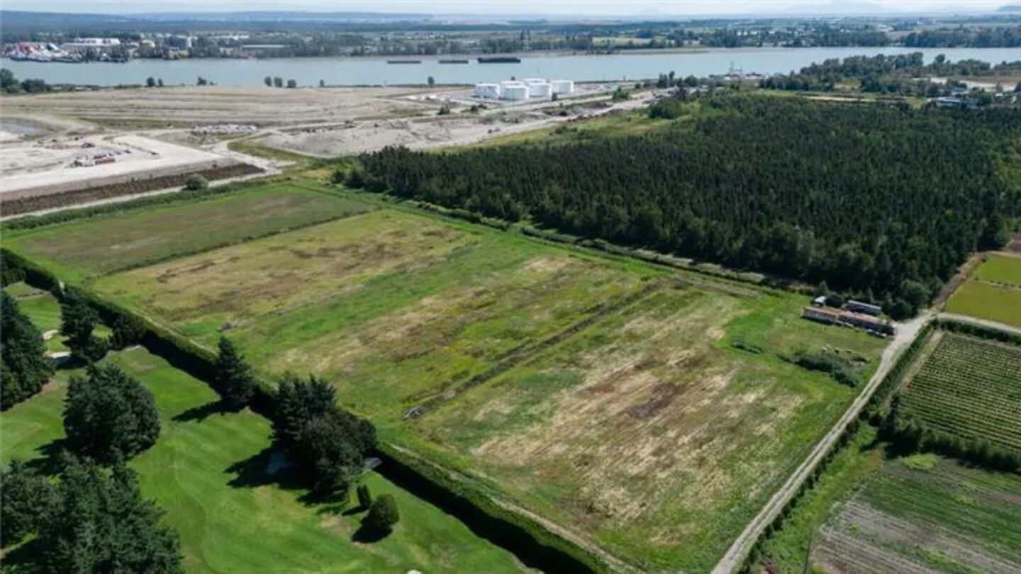 Farmland and industrial lands bordering Country Meadows Golf Course, which fall within the boundaries of a Cowichan Nation Aboriginal title claim, are seen in an aerial view in Richmond, B.C., on Friday, Aug. 22, 2025. Photo: Darryl Dyck/The Canadian Press.