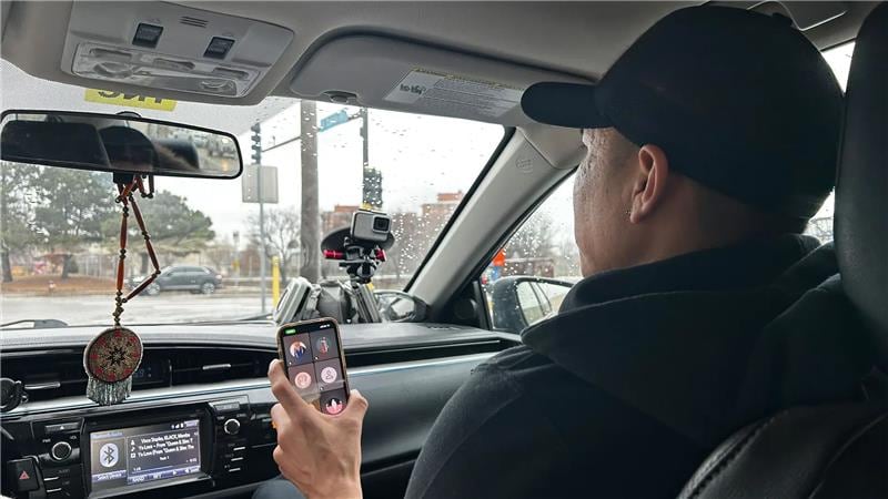 Tufawon patrols for ICE agents in the southside of Minneapolis. Patrollers don’t often go alone. This time he’s patrolling next to Oglala Lakota community member Ozuya Cikala.